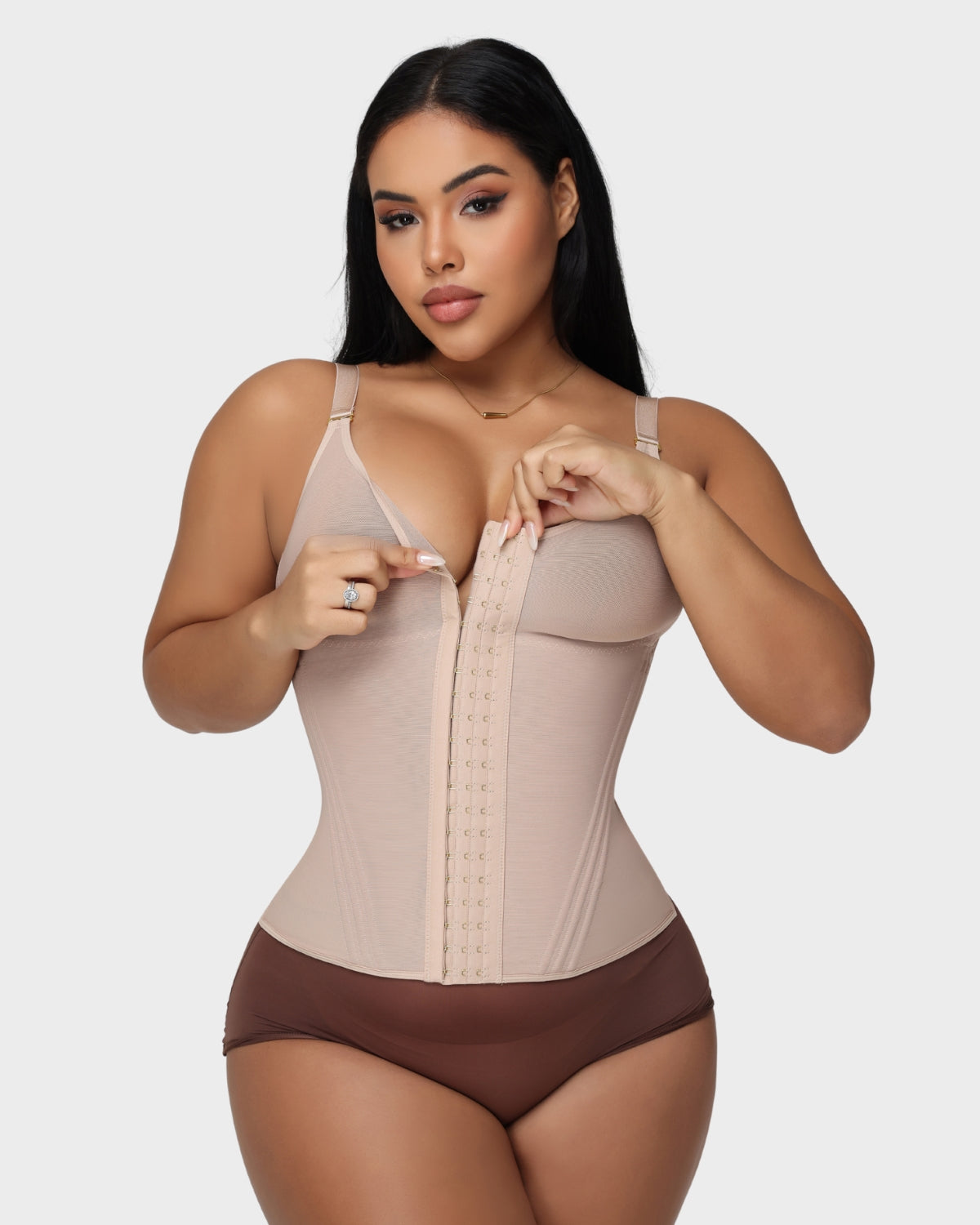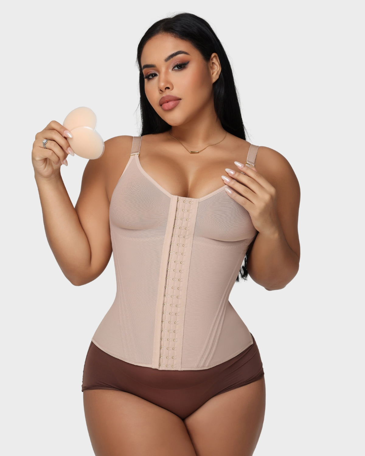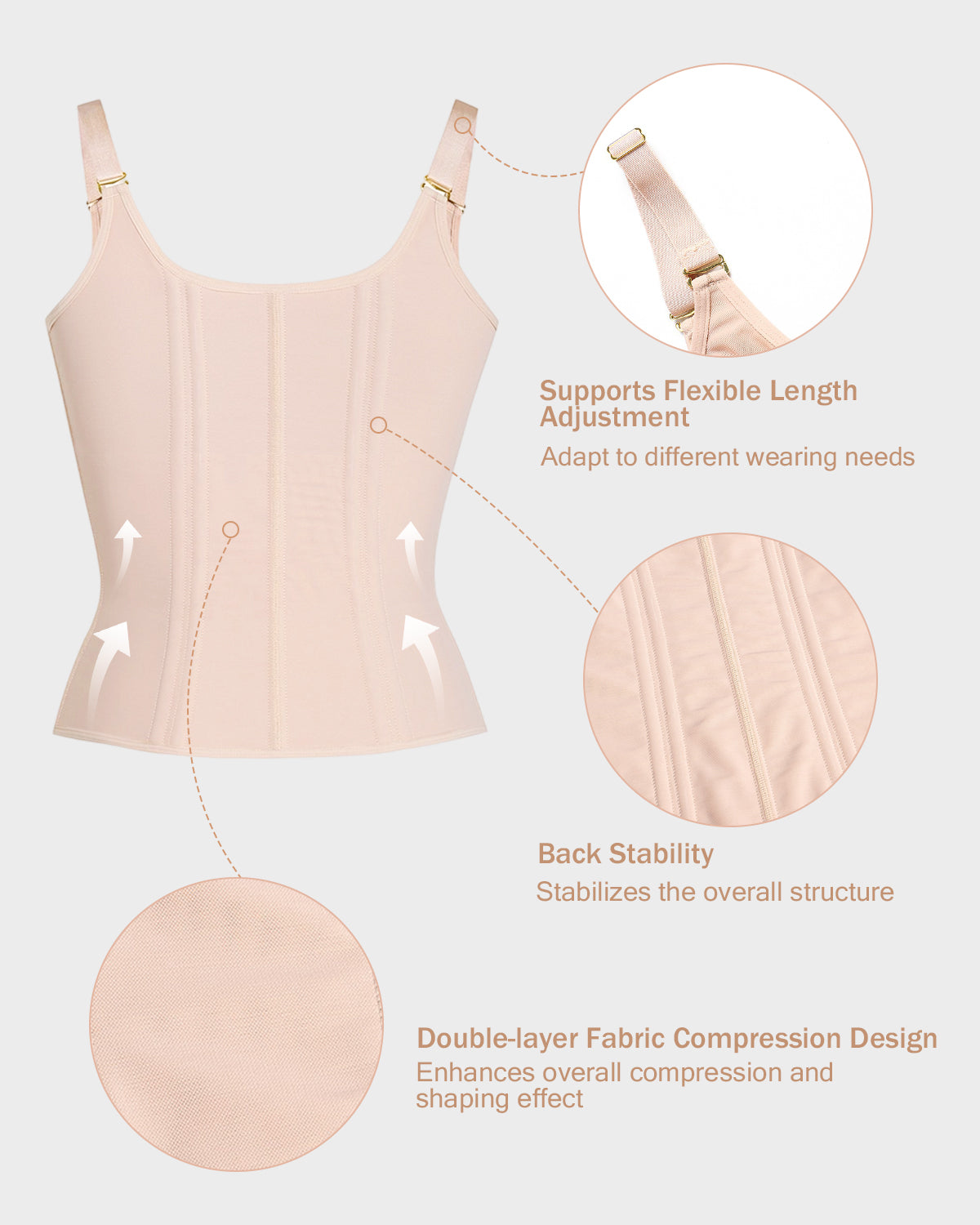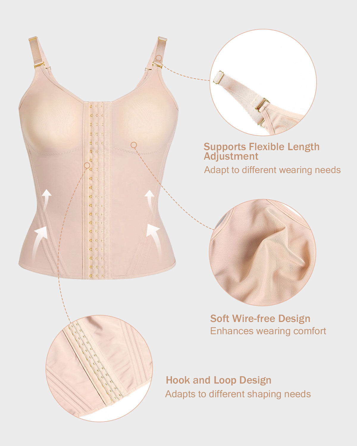 • Hook and Loop Design - Precisely adjusts the tightness at the chest and waist to suit different shaping needs.