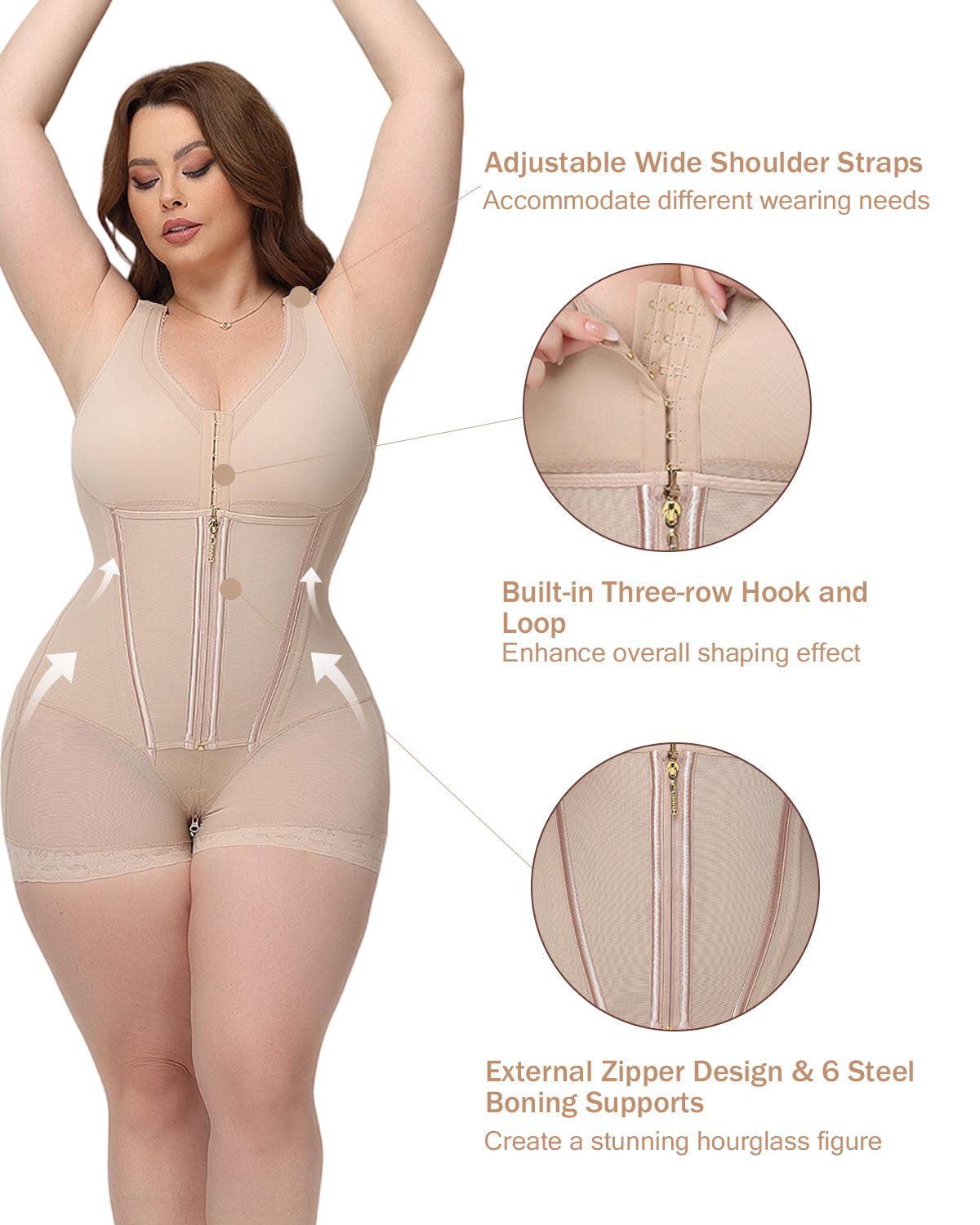 - External Zipper Design & 6 Steel Supports - Strongly tighten the side waist, creating a charming hourglass figure.