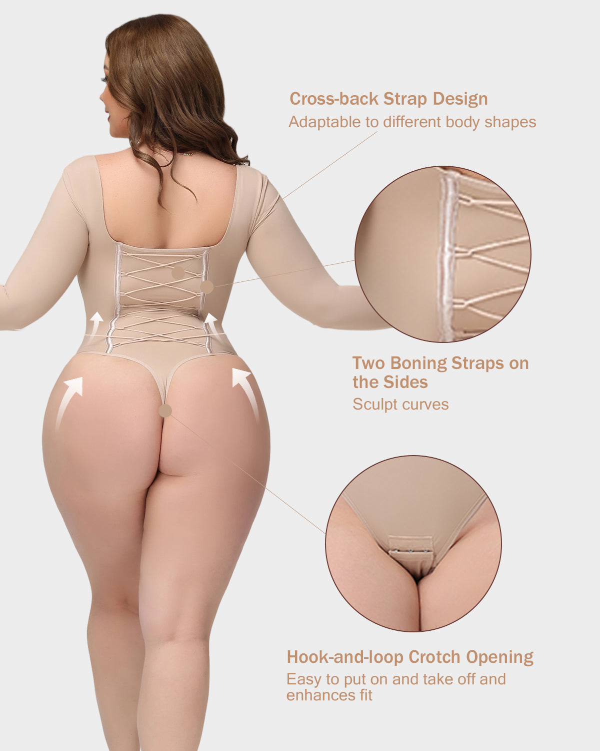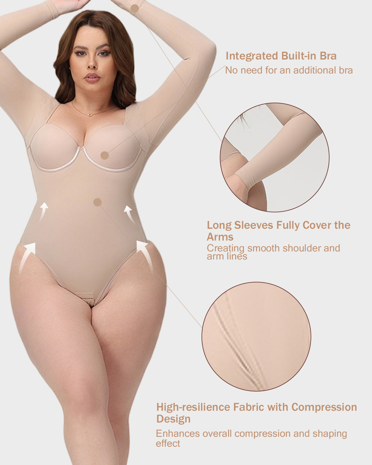 - Long-sleeved, Full-coverage Arm Design - Long sleeves cover the arms, slimming down any unwanted arm flab and creating a smooth shoulder and arm line.