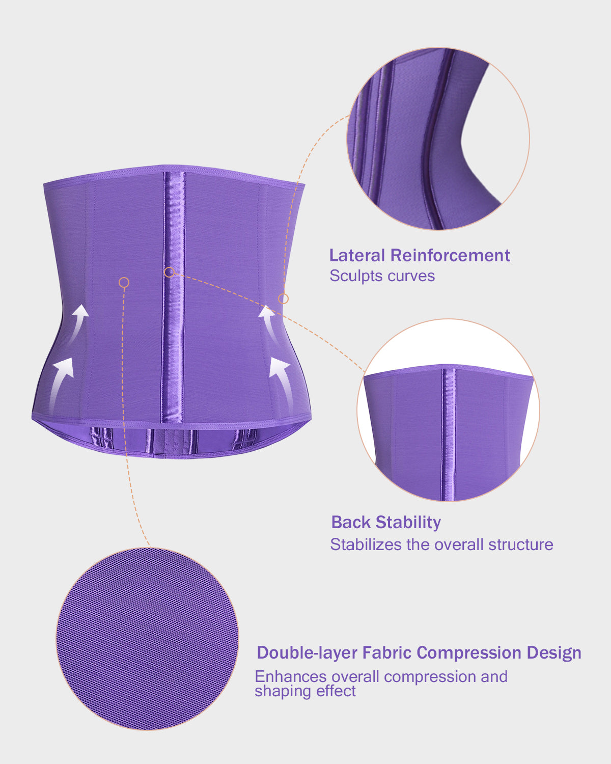 - Lateral Reinforcement - One boning support on each side of the body effectively gathers excess fat on the sides of the waist and shapes curves.