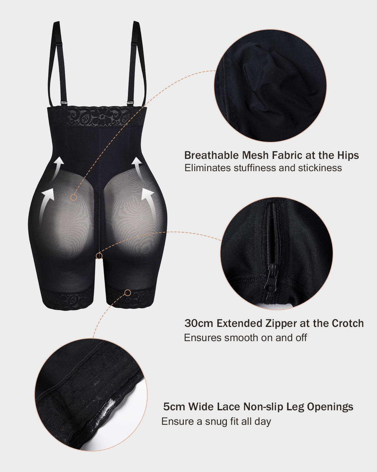 - 30cm Extended Zipper at the Crotch - Ensures smooth on and off and enhances hip coverage.