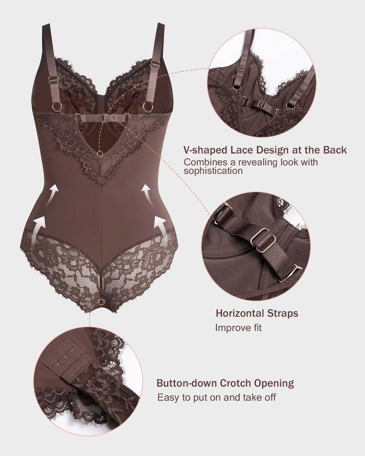 - V-shaped Lace Design at the Back - The V-shaped cutout at the back with lace embellishment combines a revealing look with sophistication, suitable for backless outerwear.