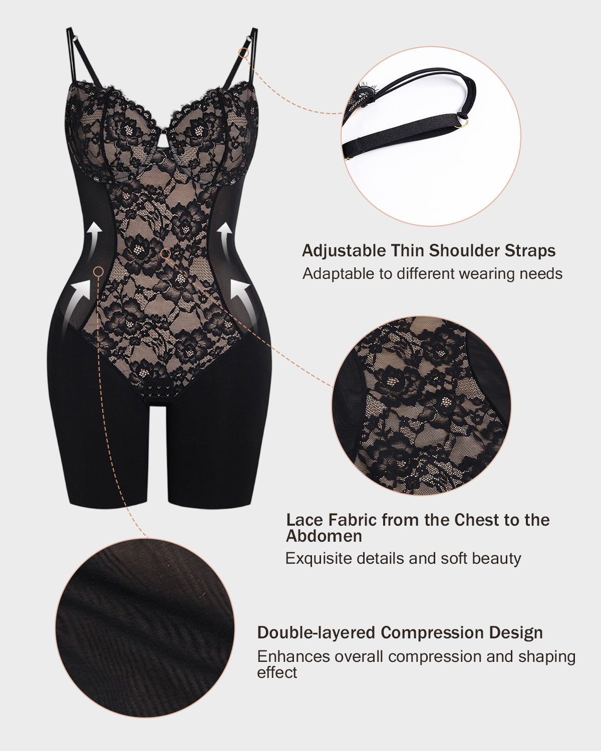 - Lace Fabric from the Chest to the Abdomen - Adds delicate details and a soft, beautiful feel.