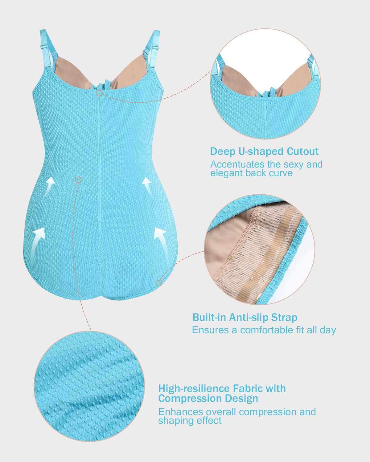 - High-resilience Fabric with Compression Design - Enhances overall compression and shaping effect while improving durability.