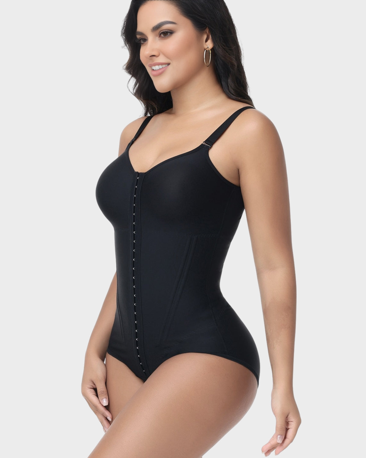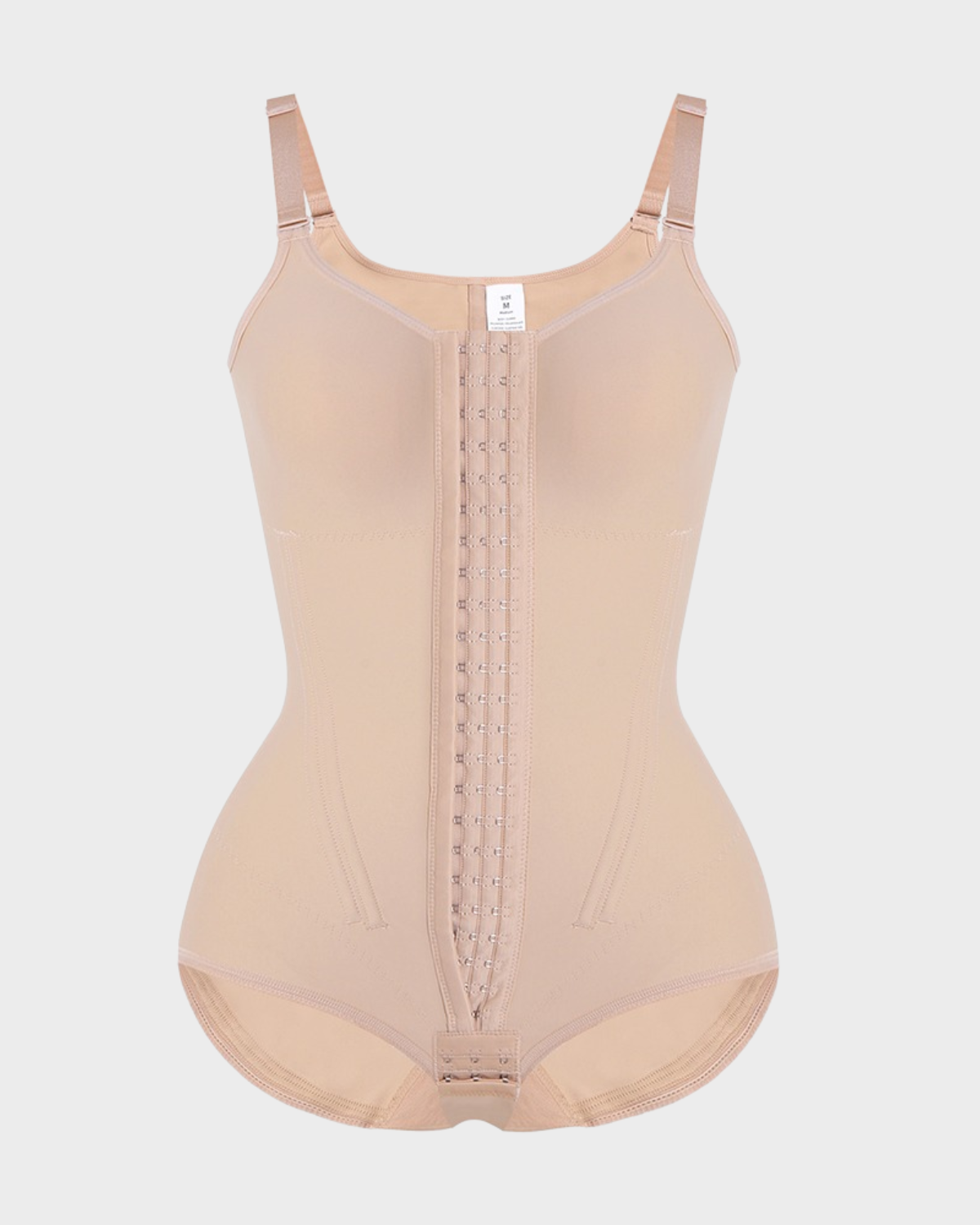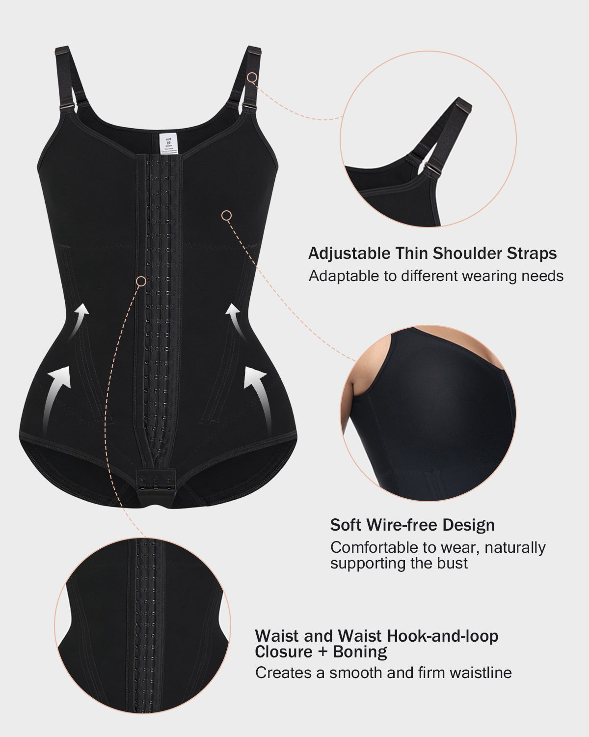 •Waist and Abdomen Hook and Loop Fasteners + Boning - The hooks provide a wide and strong closure, while four boning supports precisely tighten abdominal fat, creating a smooth and firm waistline.
